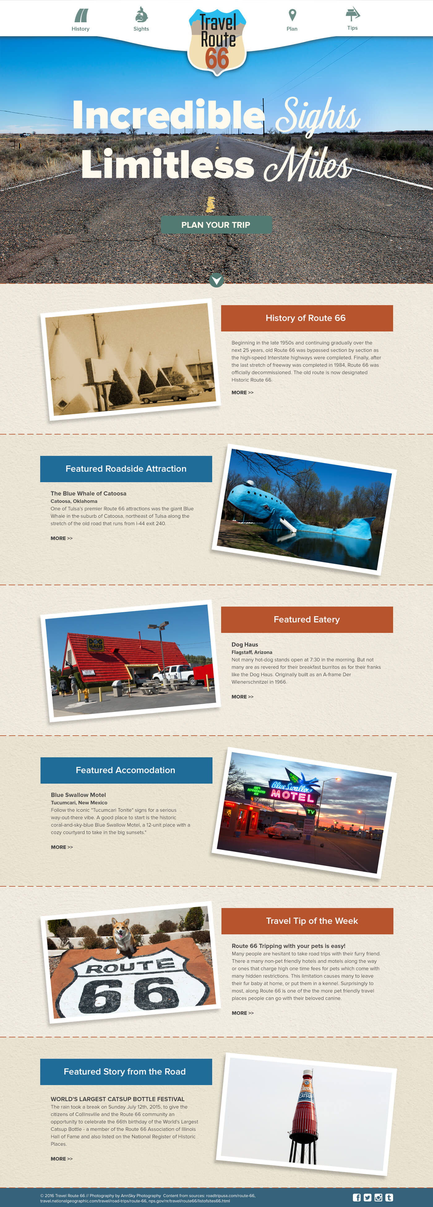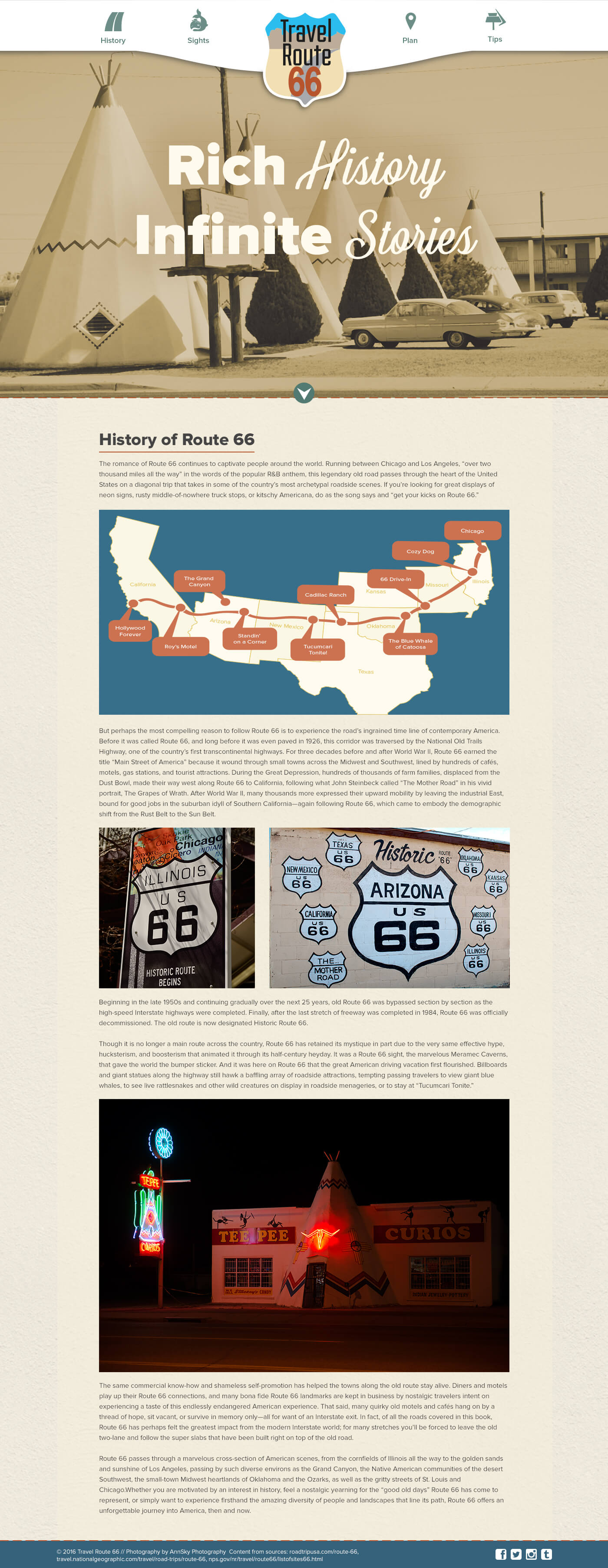 Travel Route 66 is a site designed for travelers interested in driving on Route 66. It showecases featured stops and attractions along the way, while offering historical information.